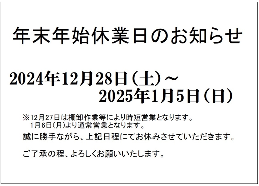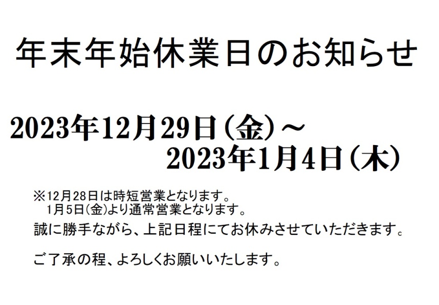 年末年始休業のご案内